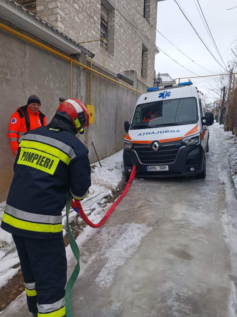 În localitatea Podgoreni, raionul Orhei, o ambulanță nu a reușit să urce o pantă acoperită de polei. Salvatorii au intervenit pentru a sprijini echipajul medical, astfel încât acesta să poată ajunge la pacient.