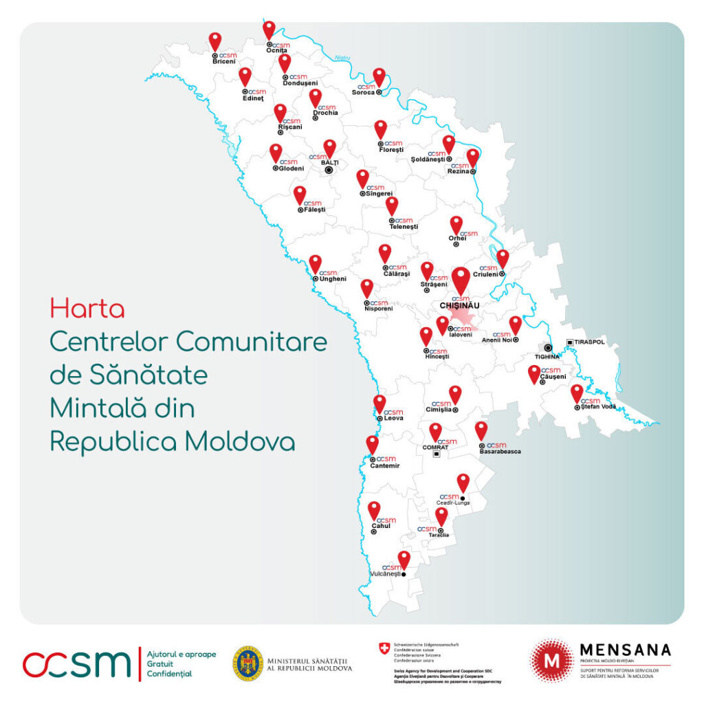 În Republica Moldova sunt 40 de Centre Comunitare de Sănătate Mintală, câte unul în fiecare raion și municipiu. Pe platforma sanatate-mintala.md pot fi găsite adresele, telefoanele și tipurile de servicii oferite, astfel încât oricine să poată identifica centrul cel mai apropiat de locuință.